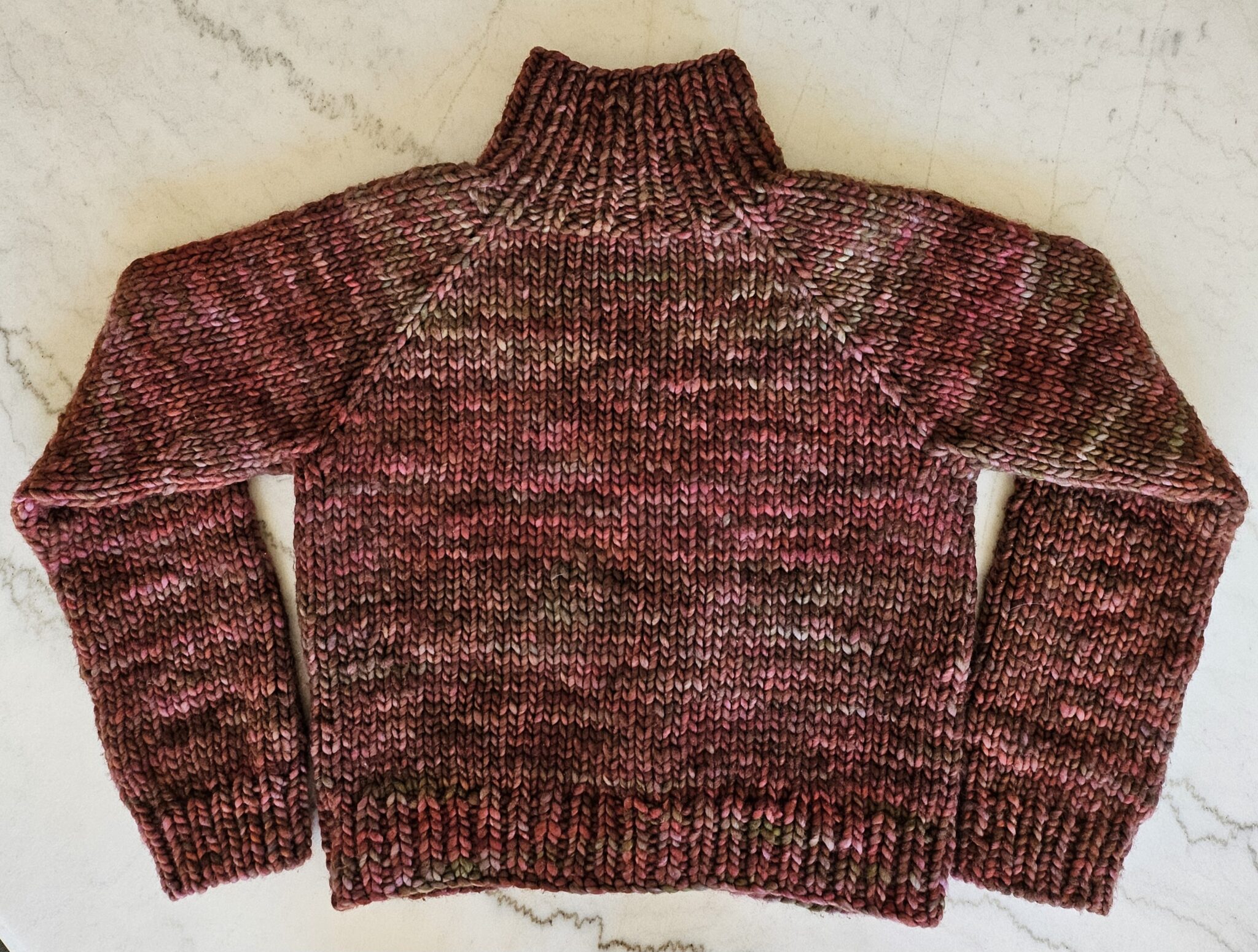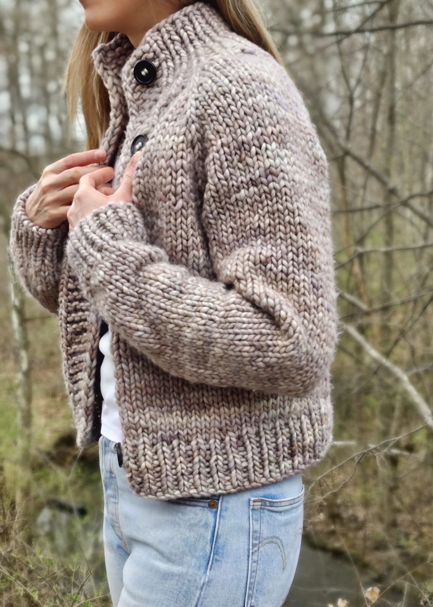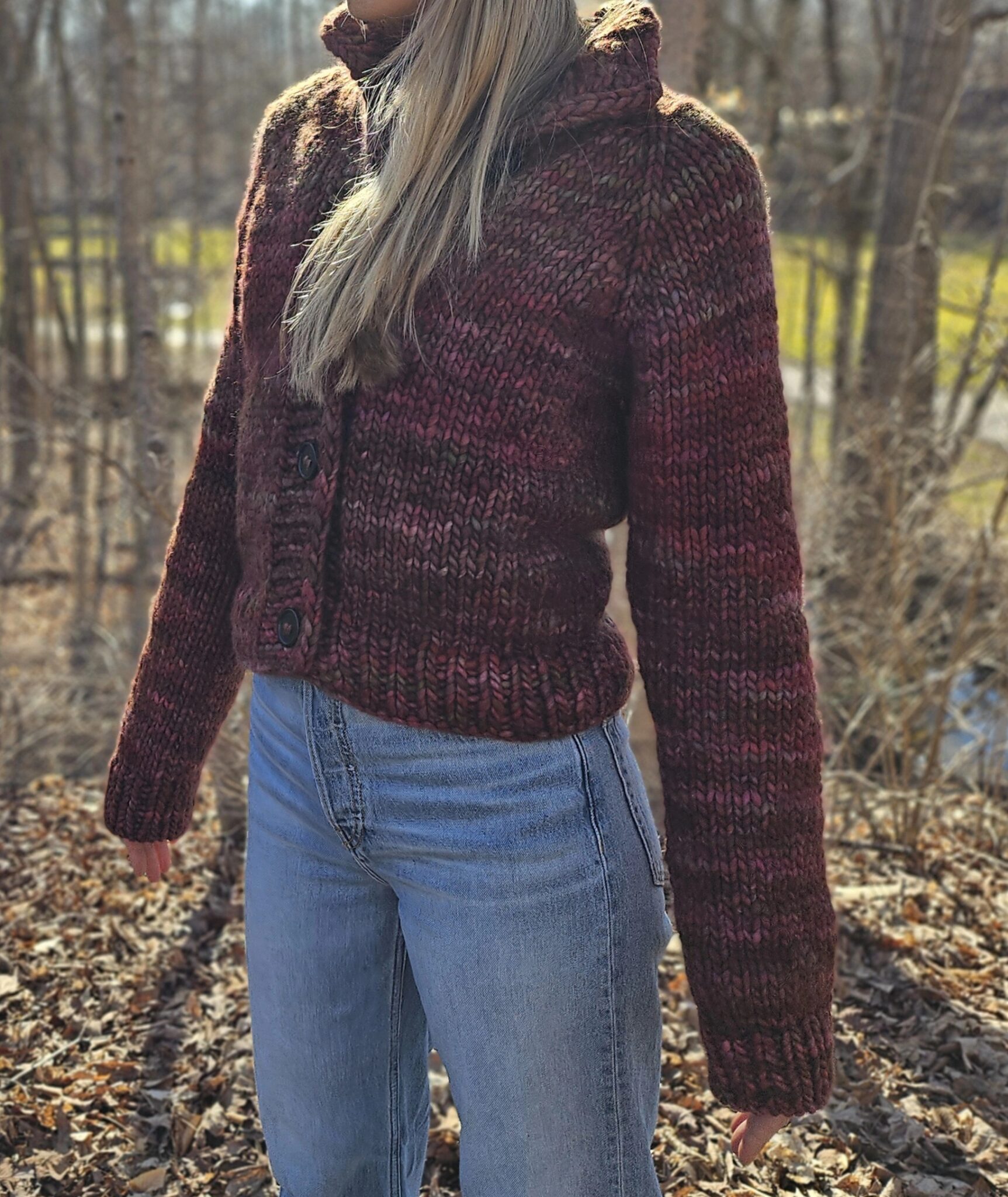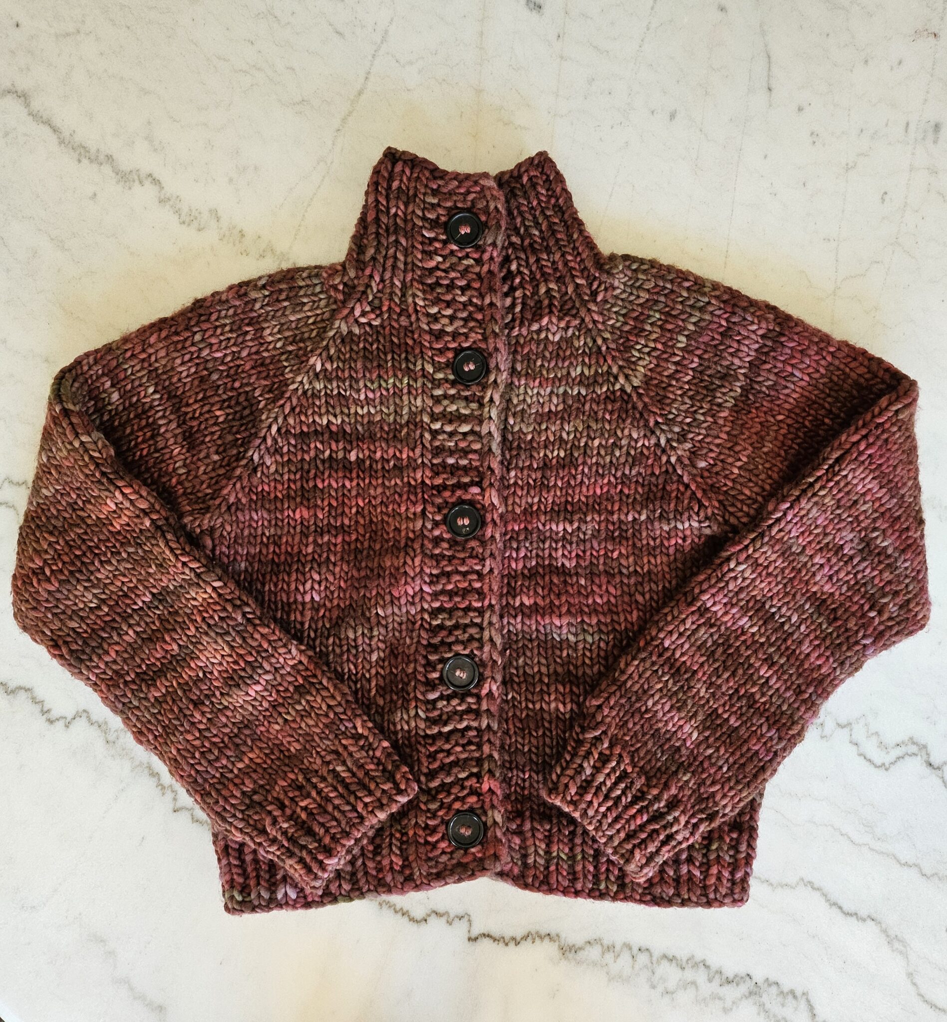 The Greenland is an ultra soft and cozy heavyweight jacket that is hand knit from artisan, hand-dyed, chunky Merino wool. It features a raglan style with high neck, decorative edging and a cropped silhouette. Natural horn button closure. Handmade in the USA. Spot Clean or Dry Clean only.